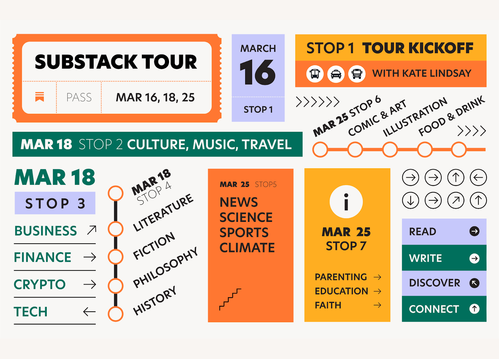 The Substack category tour is both a meeting place for writers to connect directly and a showcase for the wide variety of writing happening on Substack within a given category. Learn more about the tour below and join us at one of our stops!